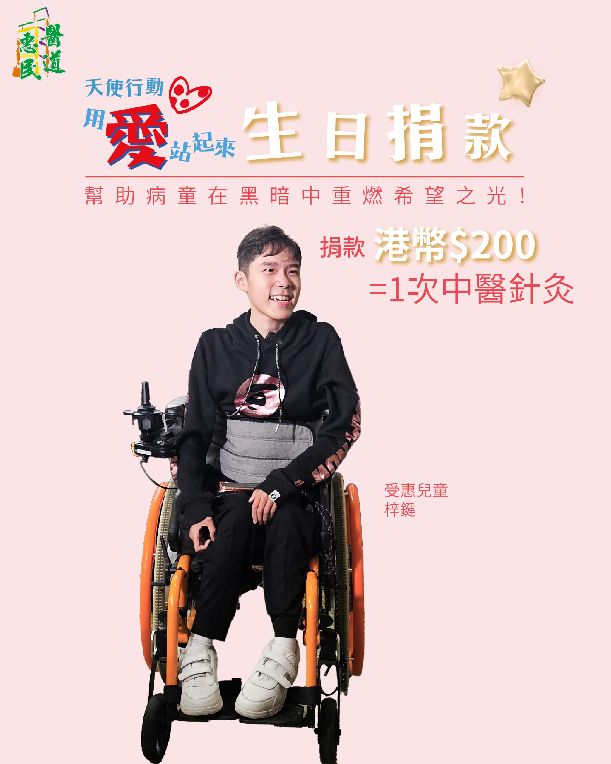 支持醫道惠民「用愛站起來.天使行動」中醫義診計劃,幫助更多像梓鍵一樣的病童得到中醫義診服務,只需捐款港幣$200,讓病童得到一次針灸,你的生日也變得更有意義。支持生日捐款計劃的壽星仔/壽星女可獲得受惠兒童繪畫的電子生日卡,並可以把生日卡分享到社交媒體,邀請親友以捐款代替生日禮物,攜手為病童的復康之路帶來希望!
